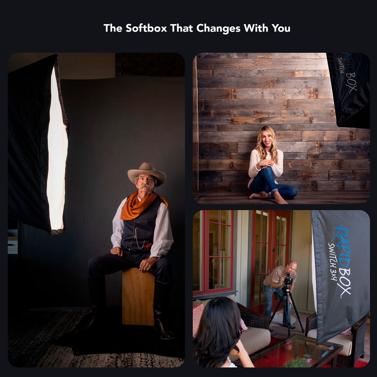 The Rapid Box Switch is designed for use with the most popular strobes, speedlites and monolights. With 13 interchangeable light mount inserts and 9 collapsible light modifiers, this is the premier softbox series that Switches with you.