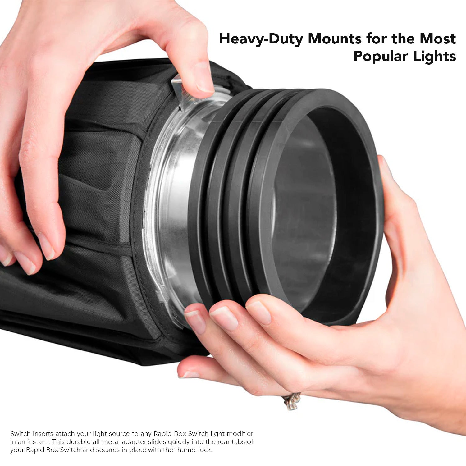 Switch Inserts attach your light source to any Rapid Box Switch light modifier in an instant. This durable all-metal adapter slides quickly into the rear tabs of your Rapid Box Switch and secures in place with the thumb-lock.