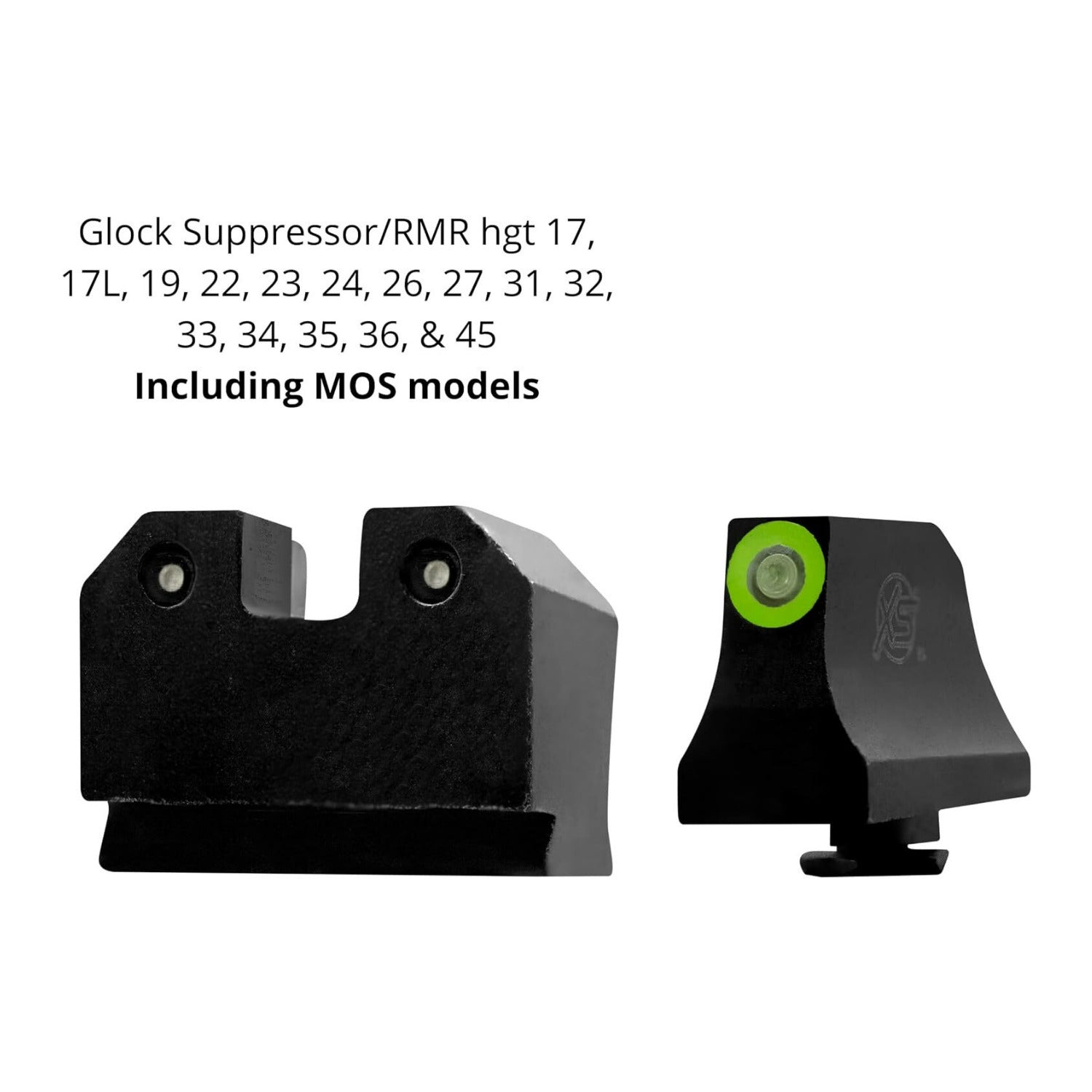 The XS Sights R3D Tritium Night Sights with Photoluminescent Glow Dot and Blacked-Out Rear Sight with Green Dot fits Glock 17, 19, 22-24, 26, 27, 31-36, 38, 45, Generations 1-5, including Mos Models. Blacked-out rear sight drives focus on the front sight and the rear sight ledge allows for one-handed slide manipulations. Sight pushers are a simple and effective way to install dovetail sights. The rounded corners in the U-Notch help you focus, allowing for less distracting alignment. The overhang and anti-reflective tritium lens reduce glare in bright light for greater sight definition, leading to easier targeting. In addition, the sights fit in most holsters for concealed carry.