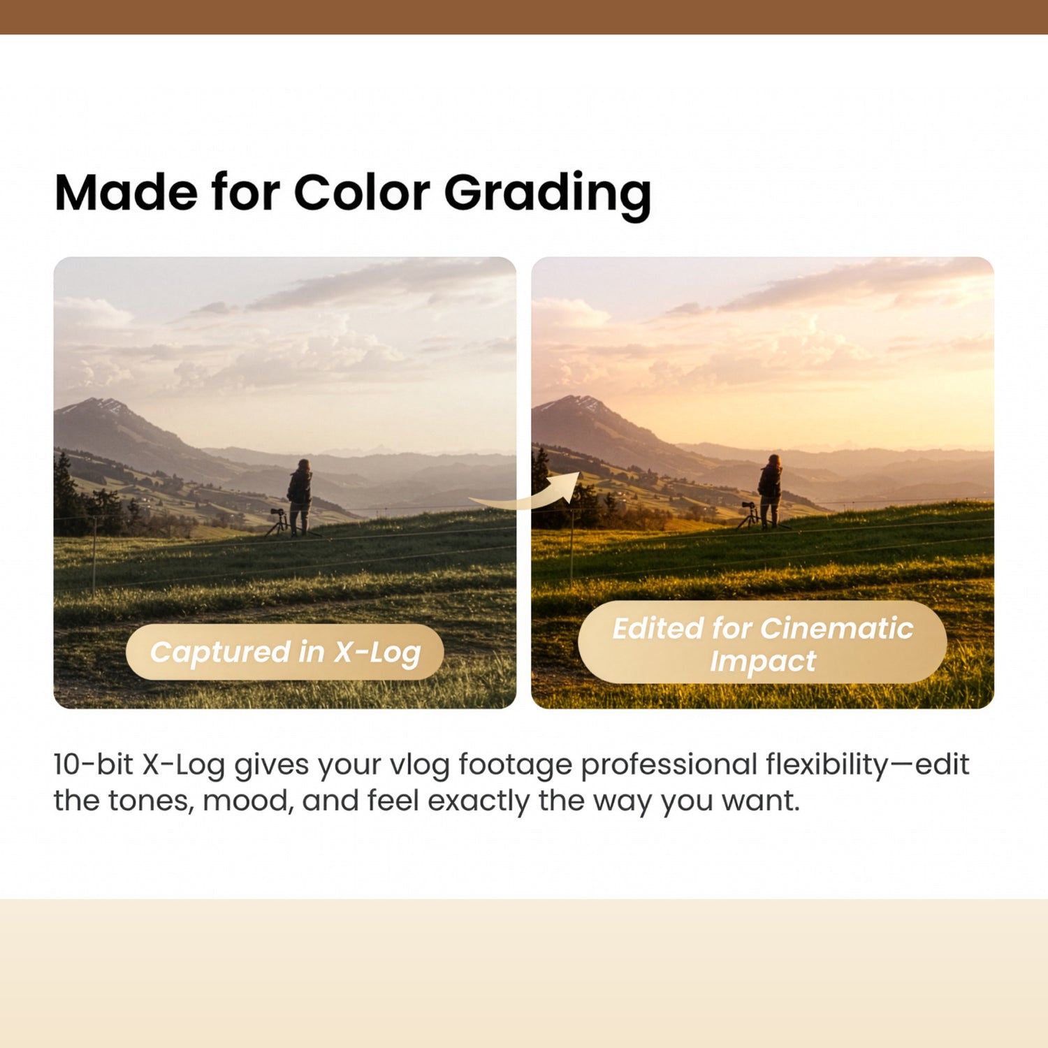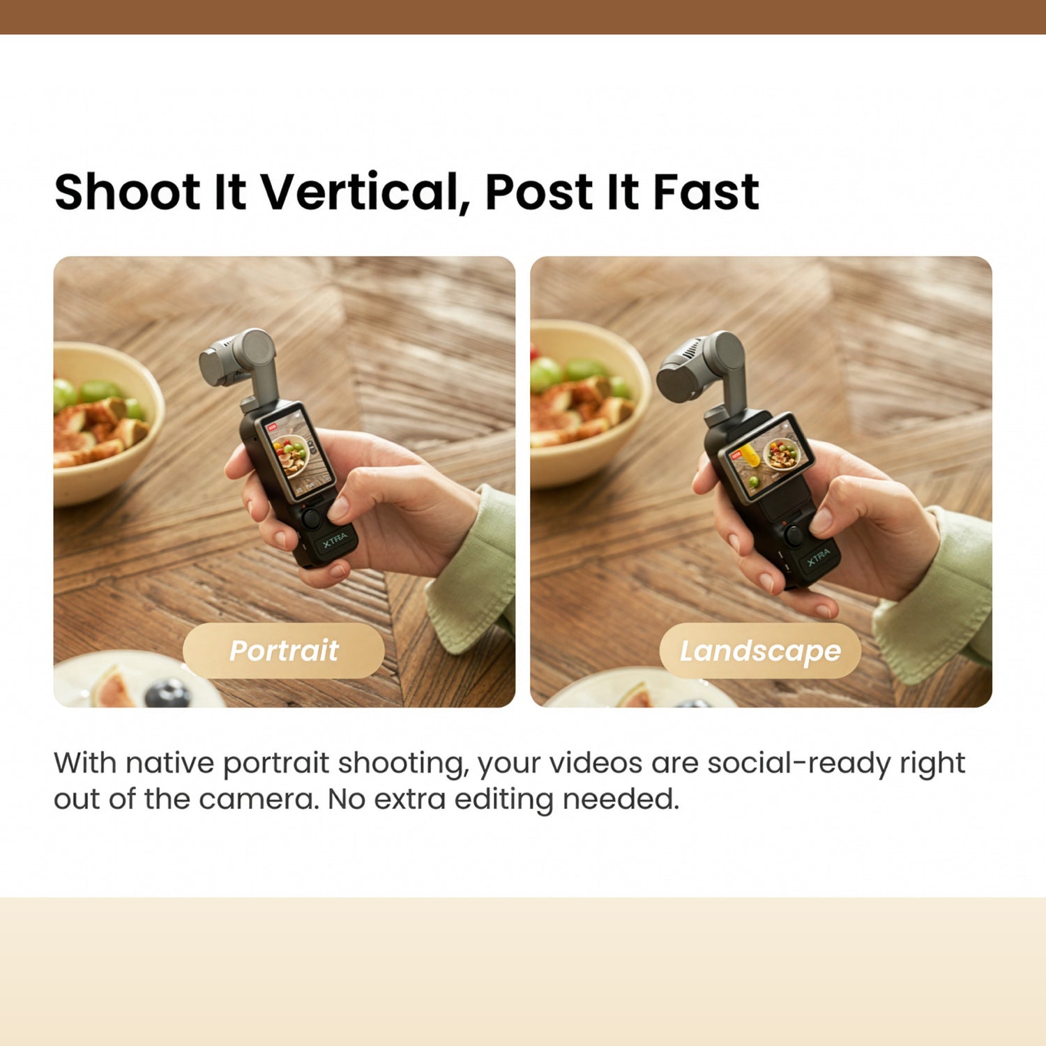 Seamless vertical shooting with a 2-inch OLED screen and dedicated Portrait Mode. What you see is what you share; post straight to social media in a snap.