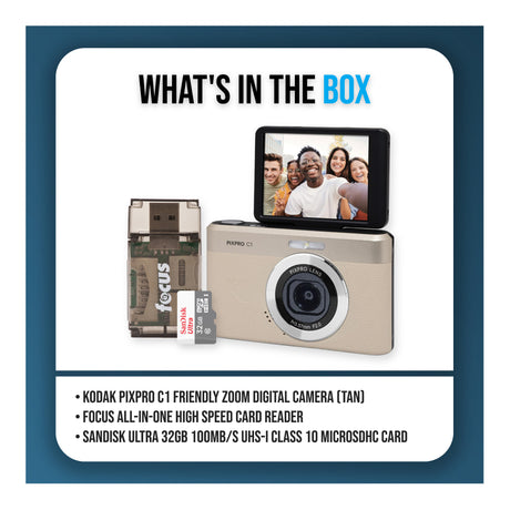 KODAK PIXPRO C1 13MP Digital Camera (Tan) with MicroSD Card and Card Reader