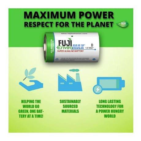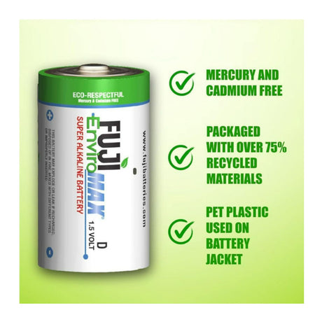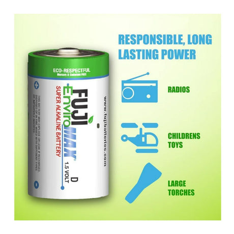 In stock$5.99Unit price /UnavailableFuji EnviroMAX D Super 1.5V 4100mAh Alkaline Battery for Clocks, Radios, and Smoke Detector (2-Pack)