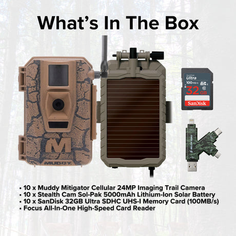 Muddy Mitigator Cellular 24MP Imaging Trail Camera (10-Pack) with 10x 5000mAh Solar Battery Bundle