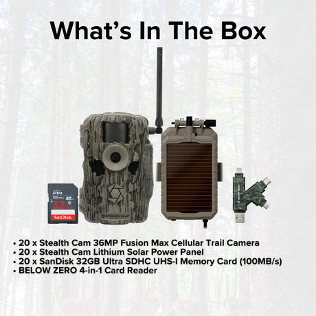 Low stock$1,149.99$1,327.88Unit price /Unavailable Stealth Cam Fusion MAX Dual Sim 36MP Trail Camera (2-Pack) x 10 with Battery (20-Pack) Bundle